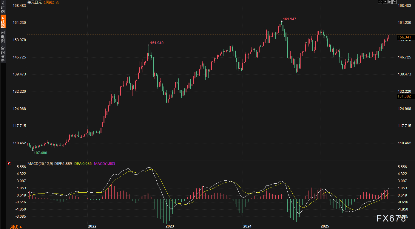 本周走势回顾:本周美元兑日元(USD/JPY)是市场波动的焦点。该货币对在周一至周四连续上涨,盘中一度突破关键心理关口,最高触及157.890,创下自今年1月15日以来的新高。周五,受日本官员强烈口头干预影响,汇价大幅回落,最终收报156.341,但周线仍录得1.19%的显著涨幅。