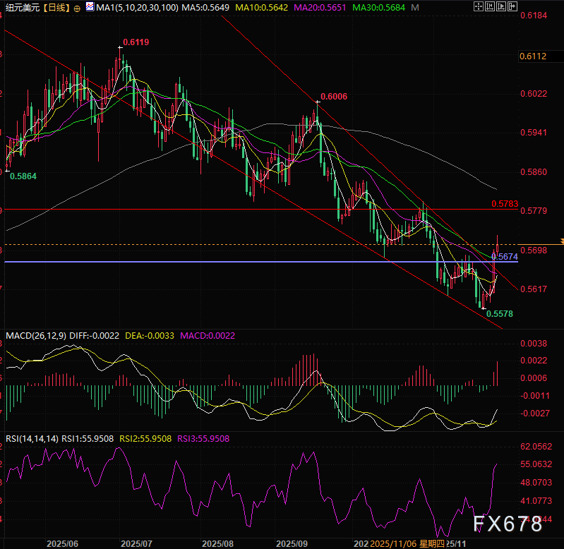 汇通财经APP讯——周四(11月27日)纽元对美元继续保持反弹格局,汇价连续两天反弹超过1.5%,目前交投于0.5711,涨0.25%。