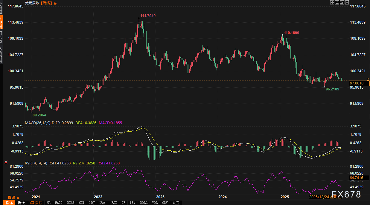 技术分析显示,美元指数周线图发出明确的疲软信号。MACD指标中,DIFF与DEA值均为负值,柱状线虽为正值显示下行动量略有放缓,但整体仍处于空头主导格局。RSI读数位于41.8,处于中性偏下区域,暗示超卖风险有限,同时反弹动能也显不足。指数从年内高点110.1699回落至当前低点97.767,96-100区间已成为多空反复争夺的关键区域。下方关键支撑位于96一线,该水平是年内多次测试的低点,其逻辑在于政策宽松预期可能引发的持续性资金外流;上方首要阻力则在100心理关口附近,突破需要基本面出现明确转向信号,例如美联储释放紧缩倾向。近期盘中需重点关注日元波动对美元的传导,以及在年末交投清淡环境下可能出现的意外波动。